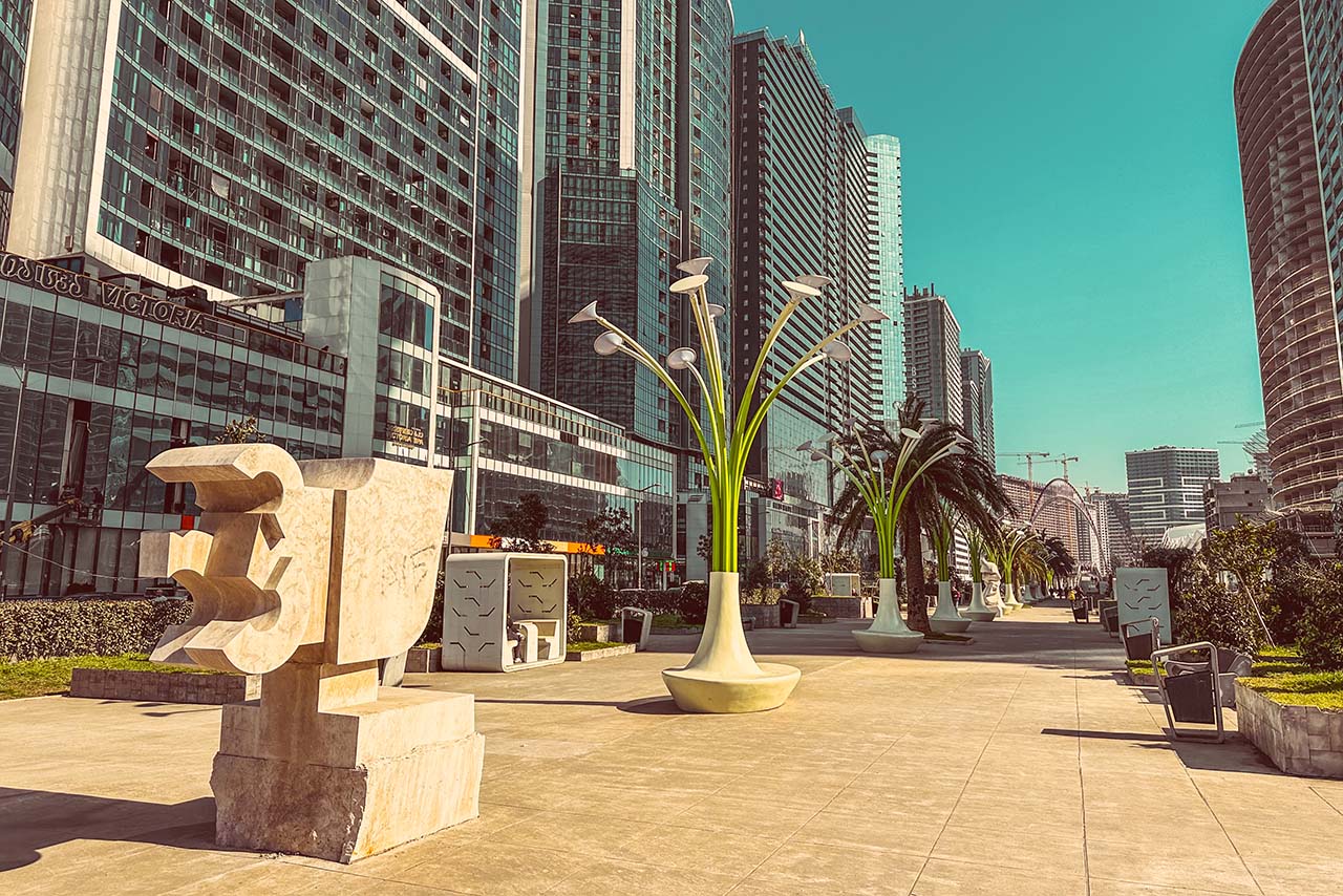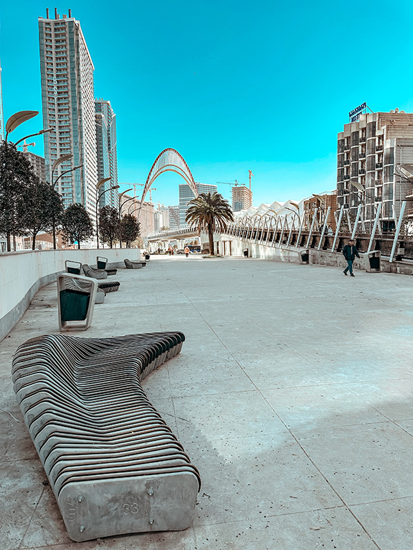 Alley of Heroes is a modern and very interesting pedestrian area, which is organized in the middle of Zhiuli Shartava Street in the Orbi skyscraper area in New Batumi. The wide boulevard was opened after a long reconstruction in 2024 and has become a favorite place for walking for both locals and tourists.