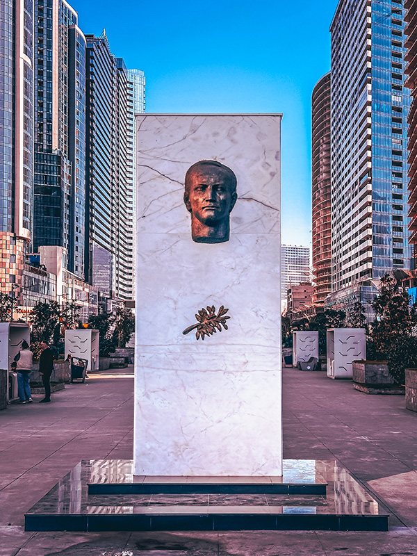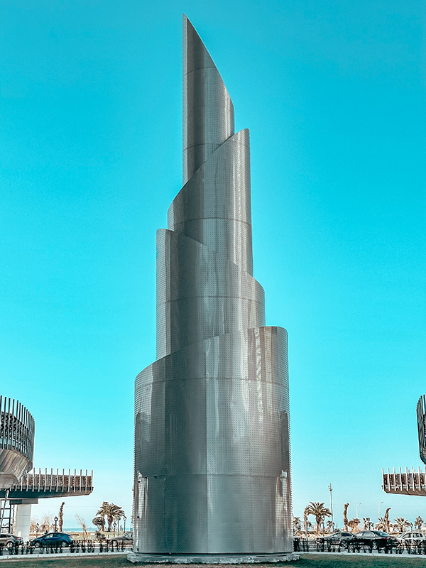 This sculpture crowns the Alley of Heroes where it reaches the sea. It is located in the center of the circle where cars move, and you can’t get to it. But you can see it from the amazing pedestrian bridge!