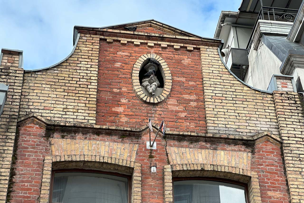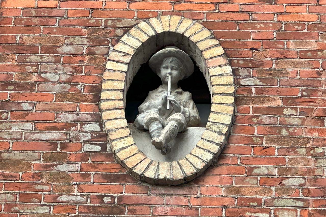 Ещё одна интересная достопримечательность находится с внешней стороны площади. Для этого вам нужно выйти на улицу Вахтанга Горгасали (это противоположный от церкви выход) и повернуть налево. Вам нужен дом №10, облицованный кирпичом. В его чердачных окошках расположились мальчики, играющие на свирели.