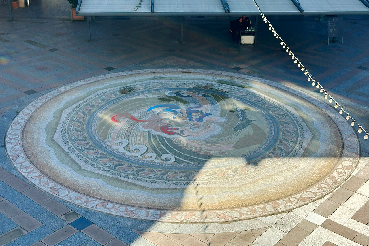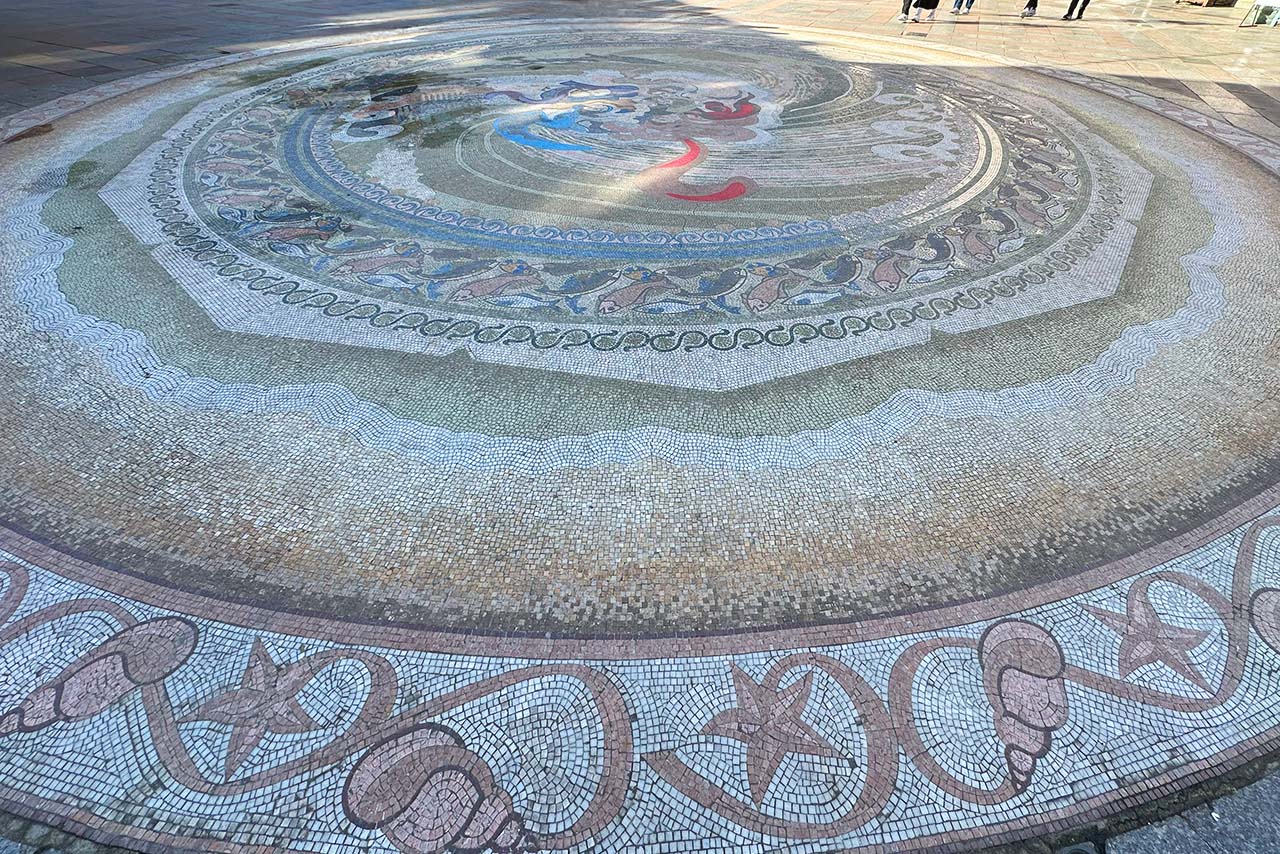 В середине площади находится огромная мозаика, выполненная на морскую тематику. Часто любят отмечать, что это самое большое мозаичное полотно, выполненное из мрамора, не только в Батуми, Аджарии и даже Грузии, но и во всей Европе. Разумеется, не историческое, а современное. Эта работа была сделана грузино-швейцарским дизайнером Натали Амиреджиби.