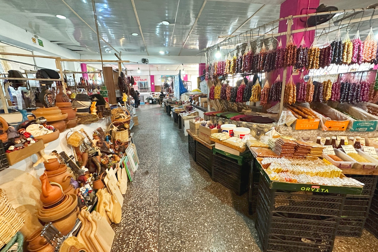 В самом здании классическая базарная атмосфера. Висят свиные и говяжьи туши, которые на месте разделываются мясниками. Пестрят своим многоцветием специи, придавая всему помещению особый аромат.