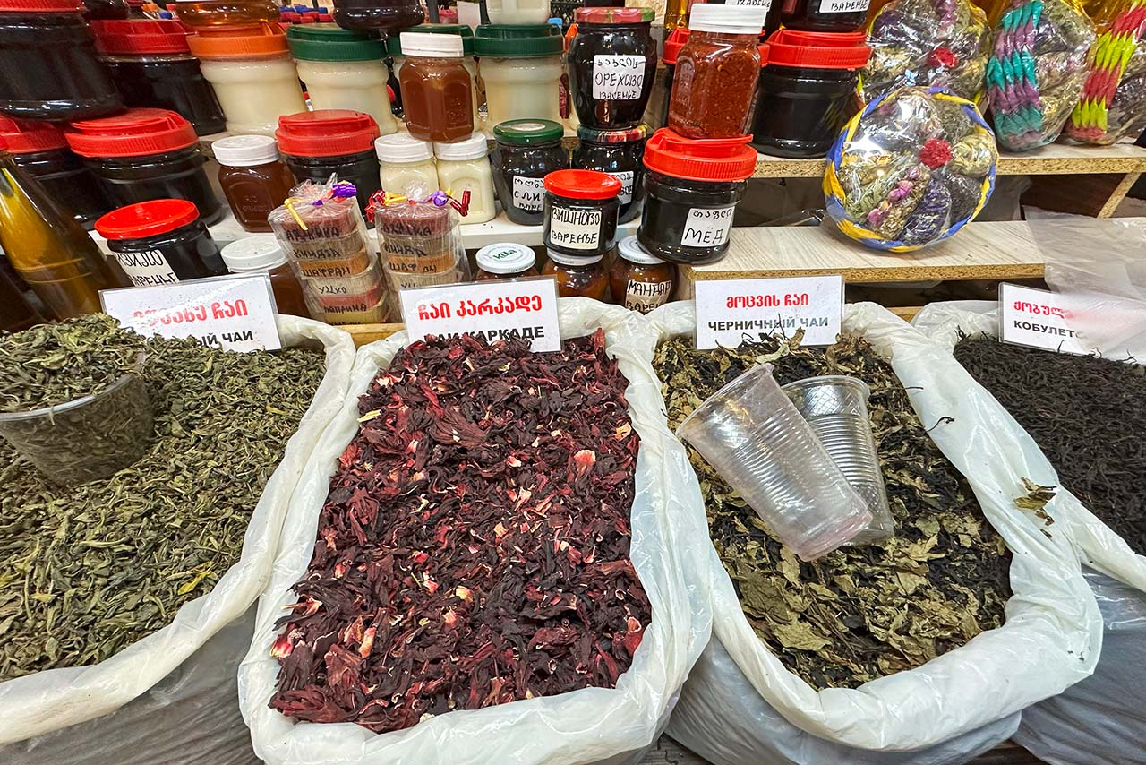 Развесной «домашний» чай — такое точно не встретишь в магазинах. Помимо классических вариантов чёрного и зелёного, здесь много и ягодных, цветочных, фруктовых собранных в домашних хозяйствах. Если я попадаю на базар, то всегда прикупаю черничный и каркаде.